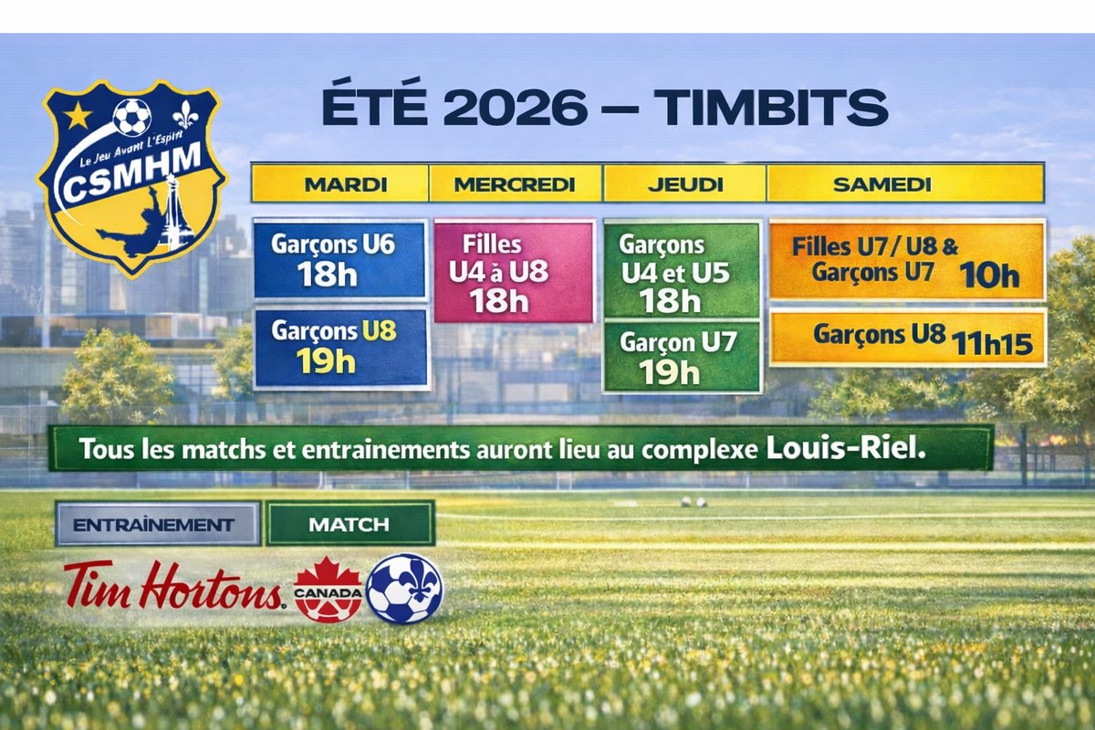 1- Pratique tous les jeudis de 18h à 18h55 pour les catégories U04 M -U05 M au Parc Louis-Riel sur la pelouse naturelle.